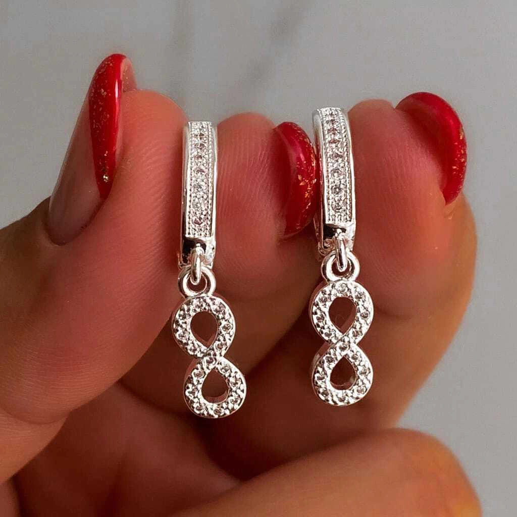 Par de argollas broquel con dije infinito, ambos terminados en brillantes, de acero blanco.